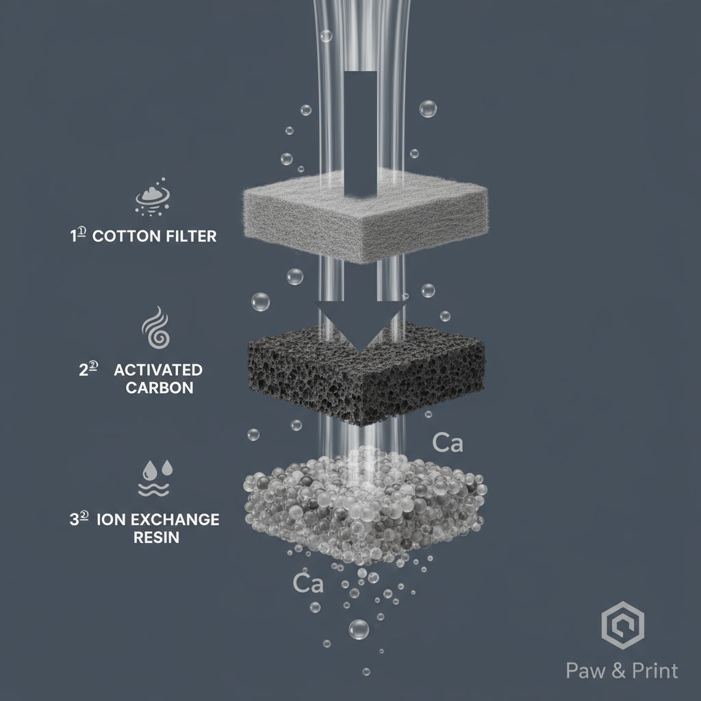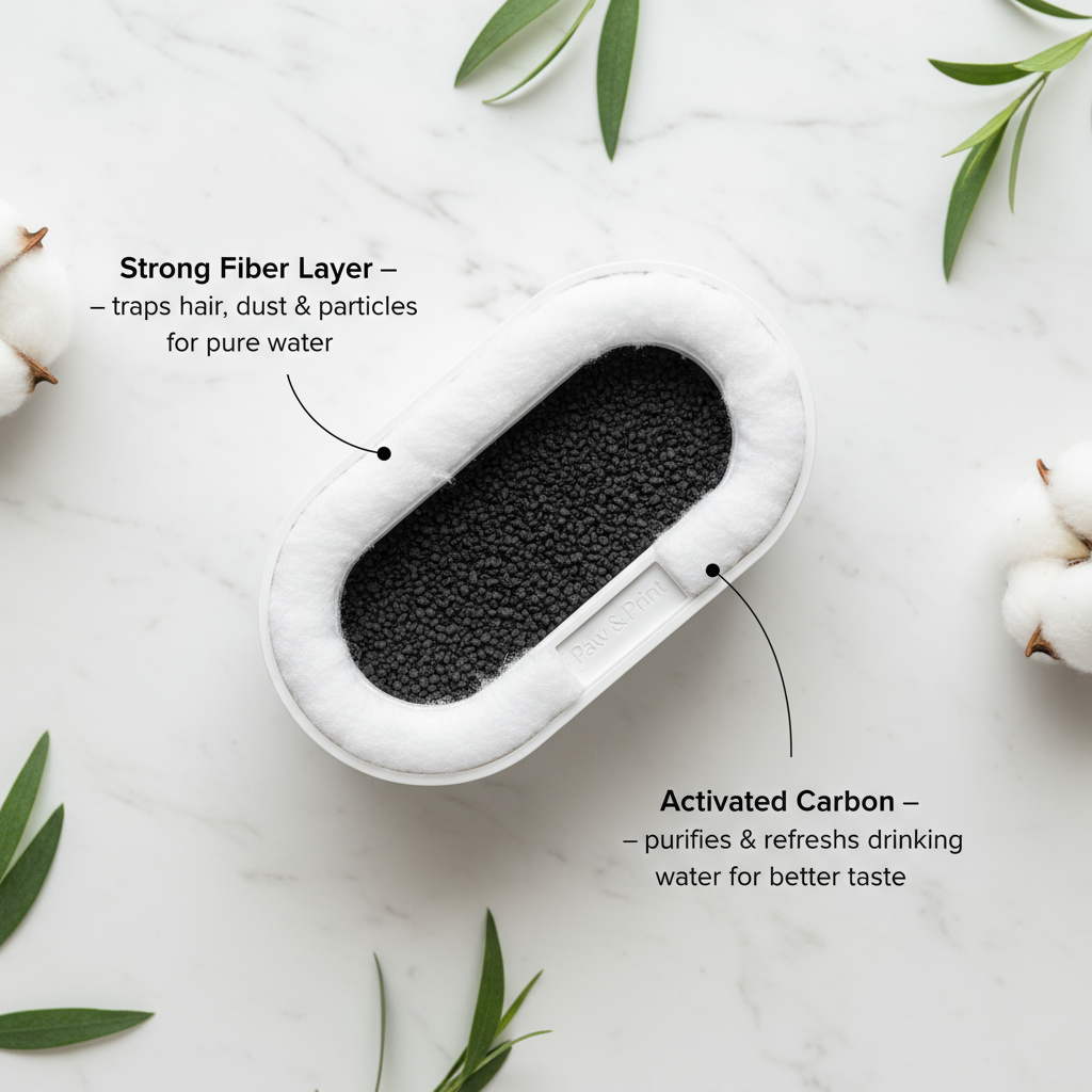 The Paw & Print Hydration Fountain keeps their water clean, cool, and constantly moving — filtering out hair, odor, and metals with a triple-layer system designed for pure hydration.